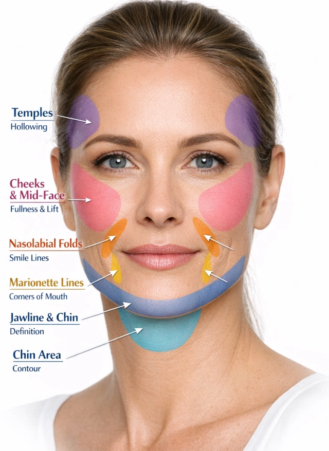 Sculptra® Aesthetic is an FDA-approved injectable formula containing poly-L-lactic acid (PLLA). Unlike other dermal fillers, such as hyaluronic acid formulas that simply fill in lines and wrinkles, Sculptra stimulates natural collagen production for volume that keeps improving with time. This makes Sculptra® Aesthetic a popular dermal filler solution when it comes to improving common signs of aging like deep facial wrinkles around the nose and mouth, hollow under eyes and temples, flattened cheeks from facial fat loss, and acne scarring.